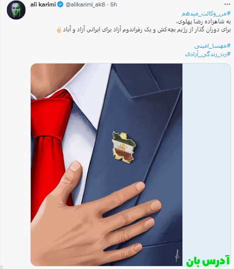 علی کریمی هم در توییتی نوشت “#من_وکالت_میدهم به شاهزاده رضا پهلوی، برای دوران گذار از رژیم بچه‌کش و یک رفراندوم آزاد برای ایرانی آزاد و آباد”